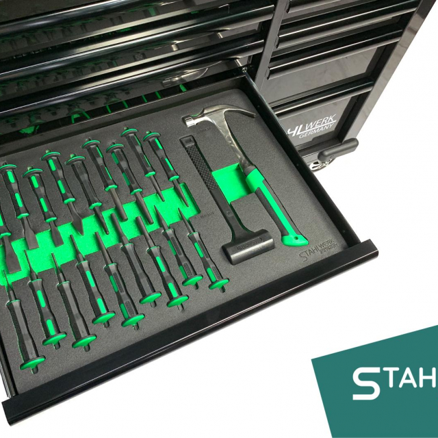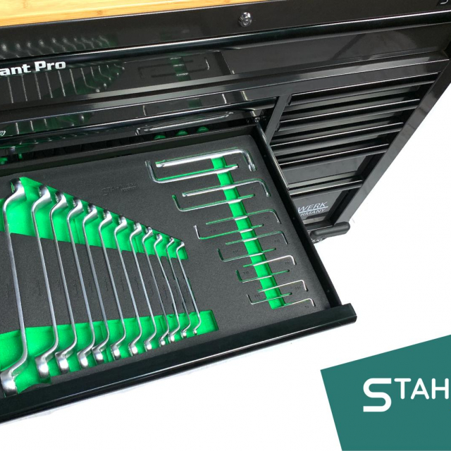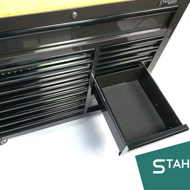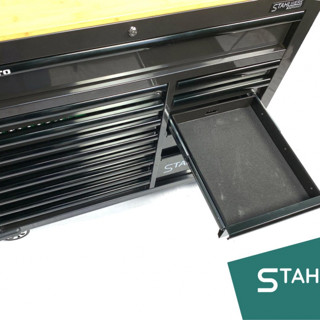 Het gereedschap zit opgeborgen in stevige schuimrubberen modules waardoor deze optimaal beschermd zijn. Door middel van de foam inlays kunt u na de werkzaamheden erg simpel zien of de gereedschapsset compleet is. Deze gereedschapswagen is simpel verplaatsbaar door de stevige stuurgreep en de robuuste vier wielen waarvan twee zwenkwielen met rem. Deze gereedschapswagen is geheel afsluitbaar door middel van 2 sleutels passend op het cilinderslot. De wagen beschikt over een extra sterk bamboehouten bovenblad.