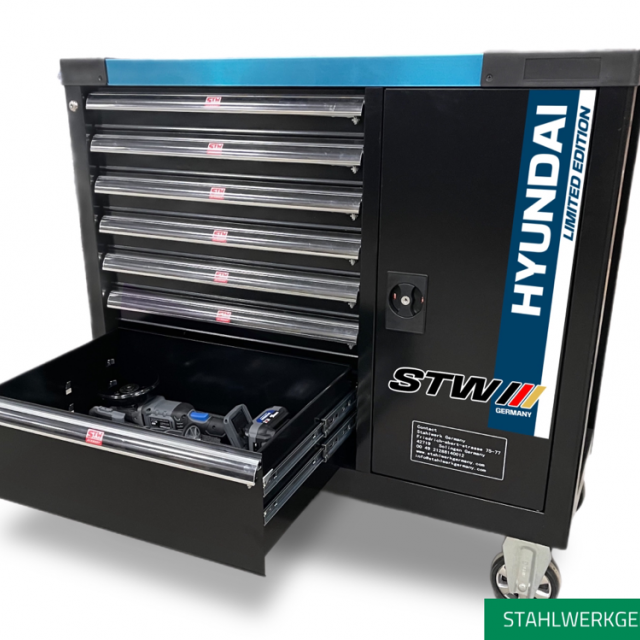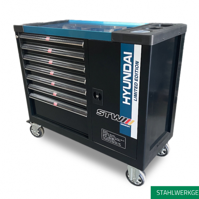 Deze STWXL werkplaatswagen heeft 7 kogelgelagerde laden, waarvan 6 gevuld met 295-delig gereedschap.