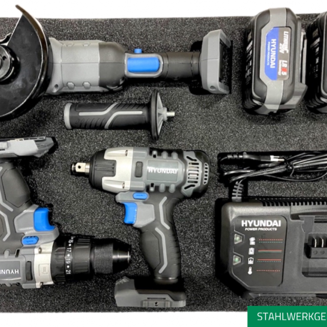 De onderste lade is gevuld met zwaar gereedschap van HYUNDAI POWER PRODUCTS 20V 5.0ah en is opgeborgen in een schuimmodule.